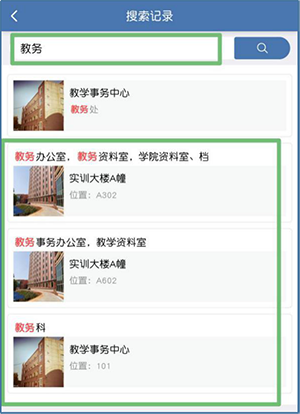在搜索栏输入内容,可搜索校园内各办公室、办公楼、公寓、宿舍、门店、食堂等。也可直接点击分类进行浏览。