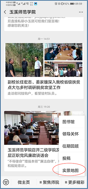 在校师生登录玉溪师范学院企业微信,在工作台中点击“实景地图”。校外人员可从玉溪师范学院公众号底部菜单的“更多精彩”中进入。