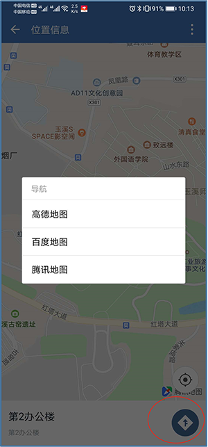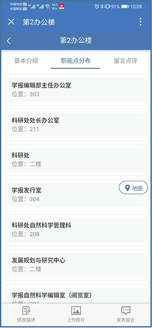 点击实景名称可查看图片文字,点击职能点分步可查看办公室位置,点击地图可查看地图,在地图上点击下方导航图标可弹出手机已安装地图软件进行导航,推荐使用腾讯地图或百度地图。